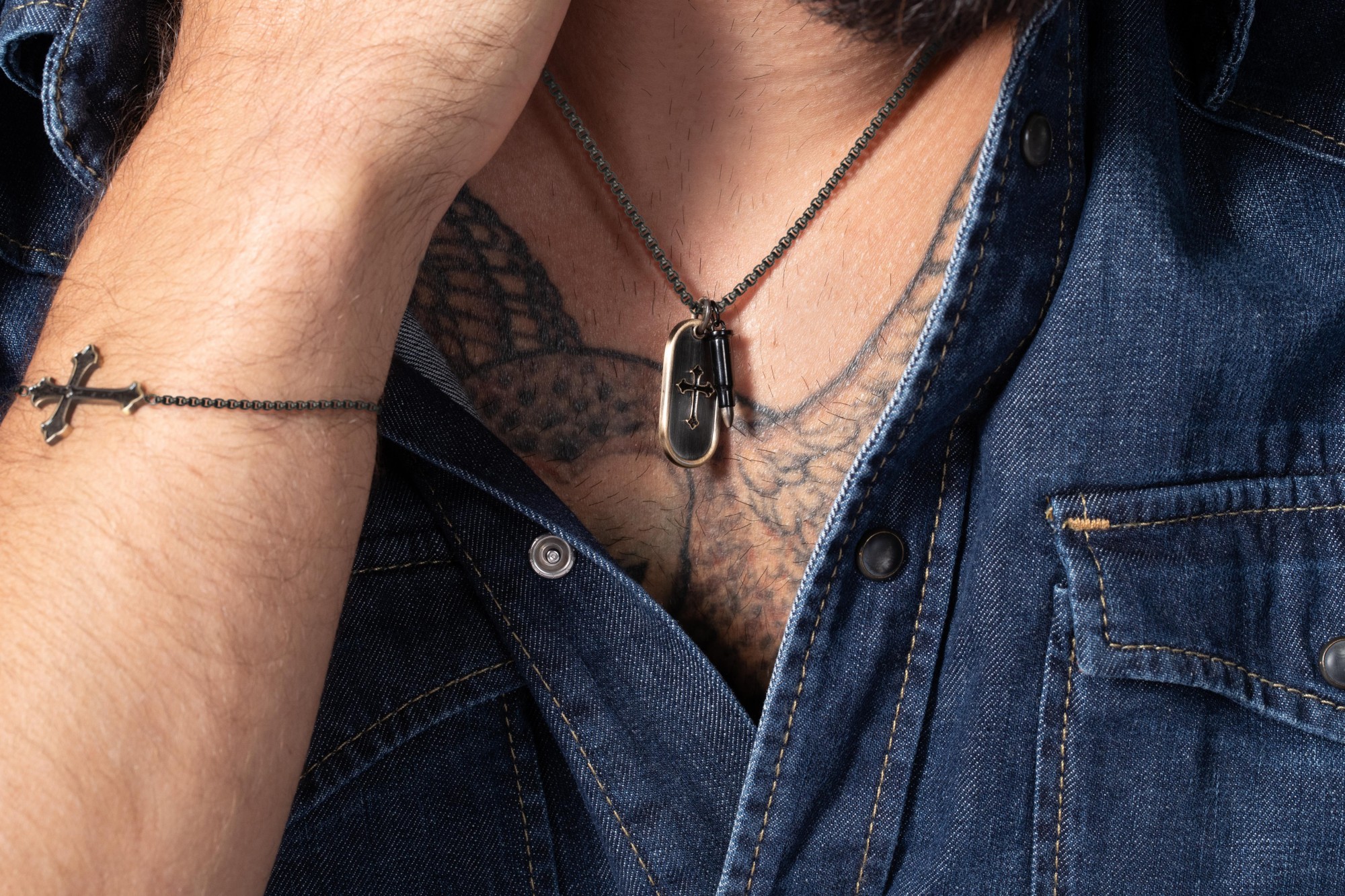 Un collier riche de sens. Avec le collier Jin de Phebus à double pendentif, arbore autour du cou une cartouche au motif de croix gothique et une balle. En acier 316L inoxydable noir et bronze, sa chaine vénitienne réglable de 50 à 55 cm possède un fermoir à mousqueton. L'ensemble du bijou est garanti 2 ans et conçu pour durer de nombreuses années. Un collier avec pendentifs pour homme aux symboles chargés de sens. Dévoile toi en portant ces symboles spirituels dont le sens caché attire. La croix revêt bien des significations puissantes : elle peut aussi bien témoigner de ta foi que rendre hommage à un être cher, ou tout simplement ton attrait pour le spirituel. Quant à la balle, elle peut aussi bien représenter la mort que la rébellion ou la protection, elle te permet dans tous les cas d'imposer ton style avec fracas.