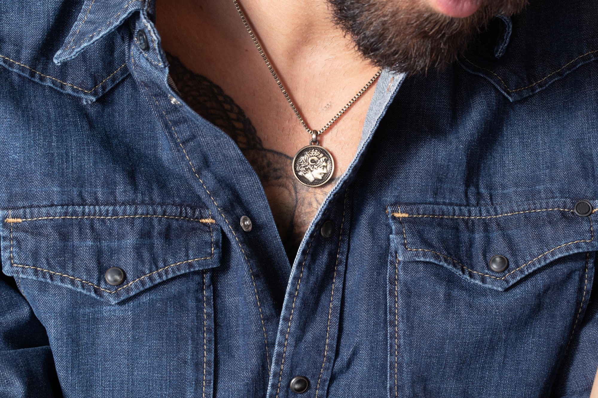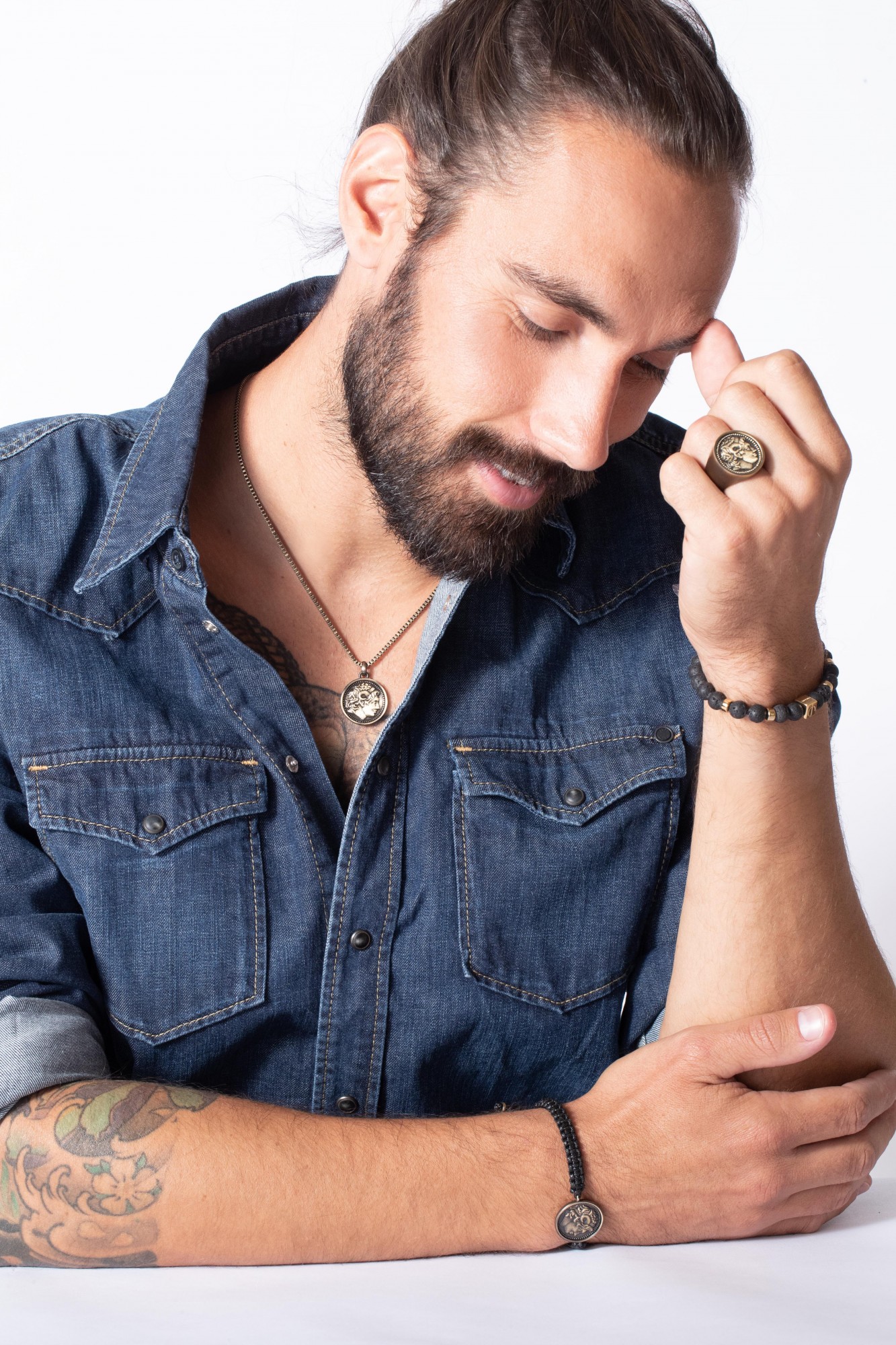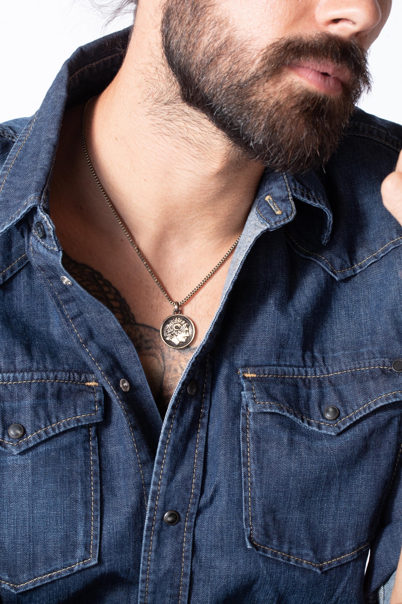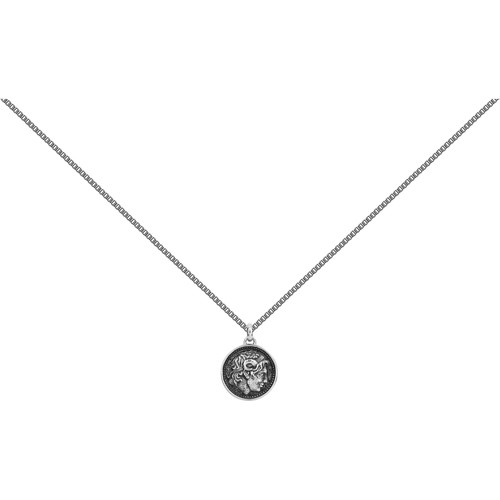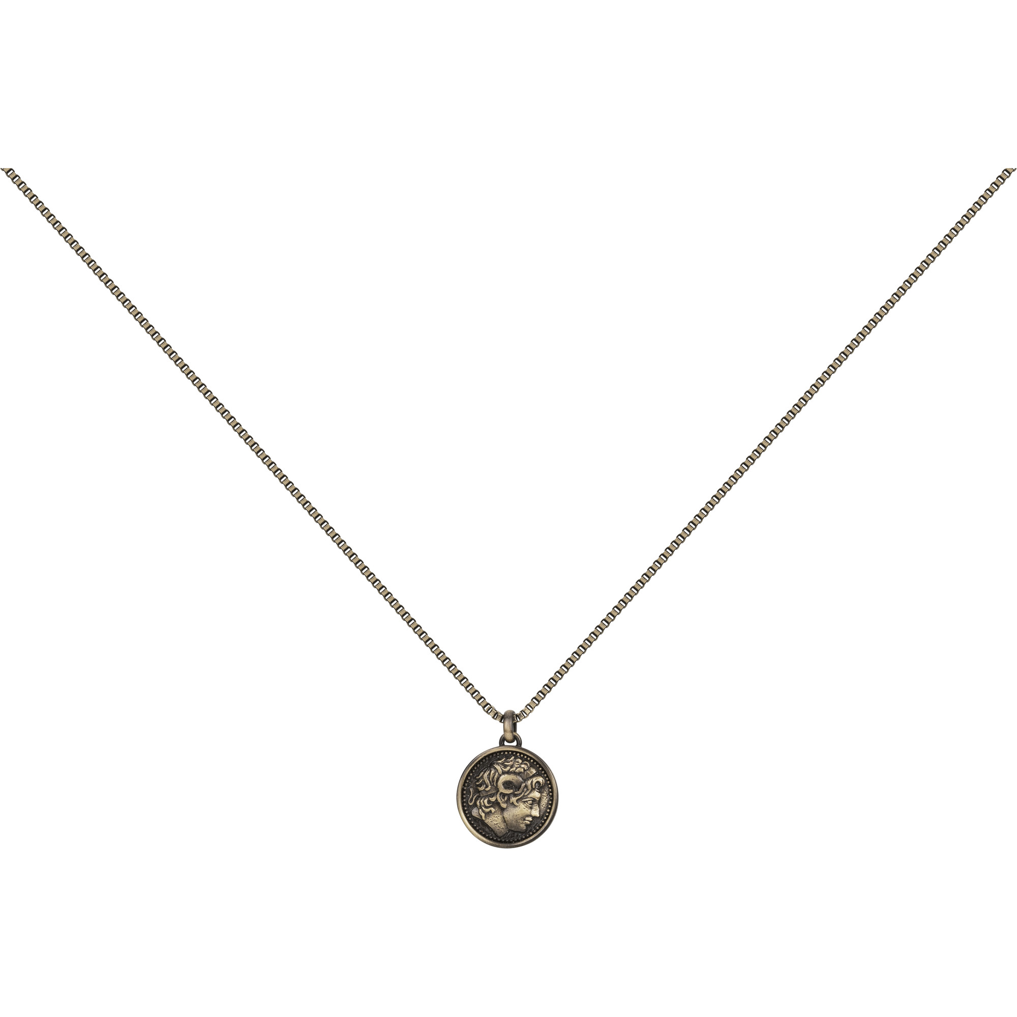 Collier Legend, medaille Alexandre sur chaine, en acier 316L inoxydable bronze. Longueur réglable de 50 à 60 cm. Fermoir mousqueton.