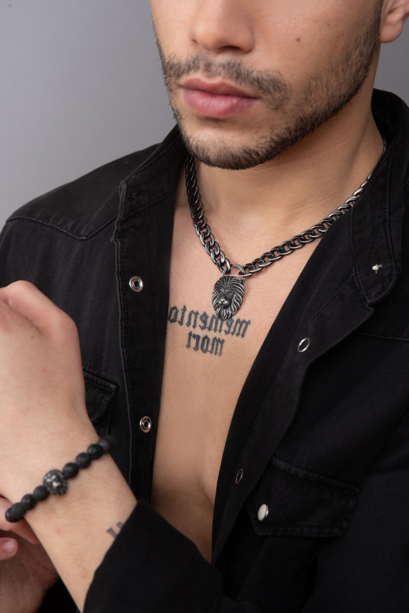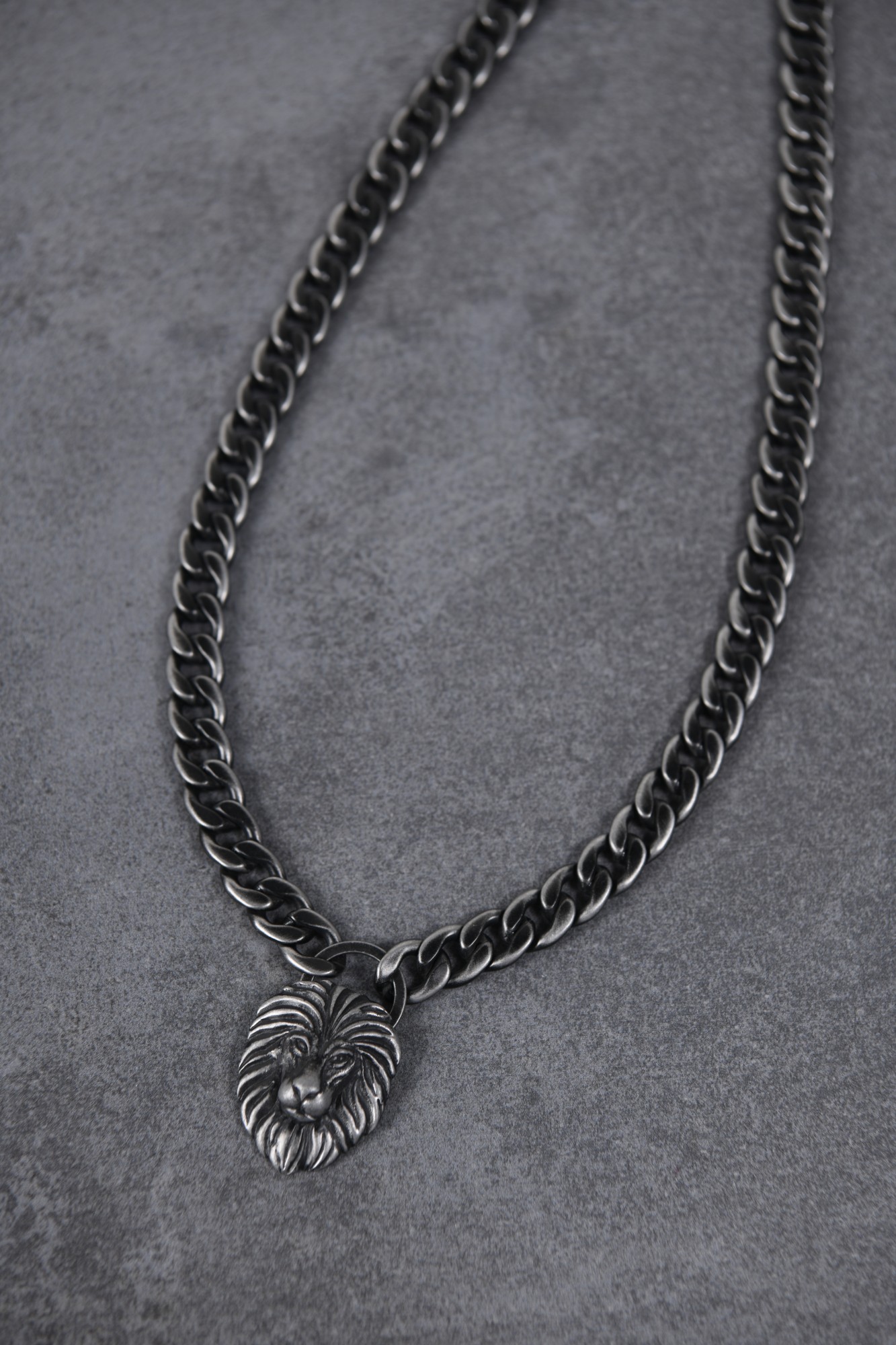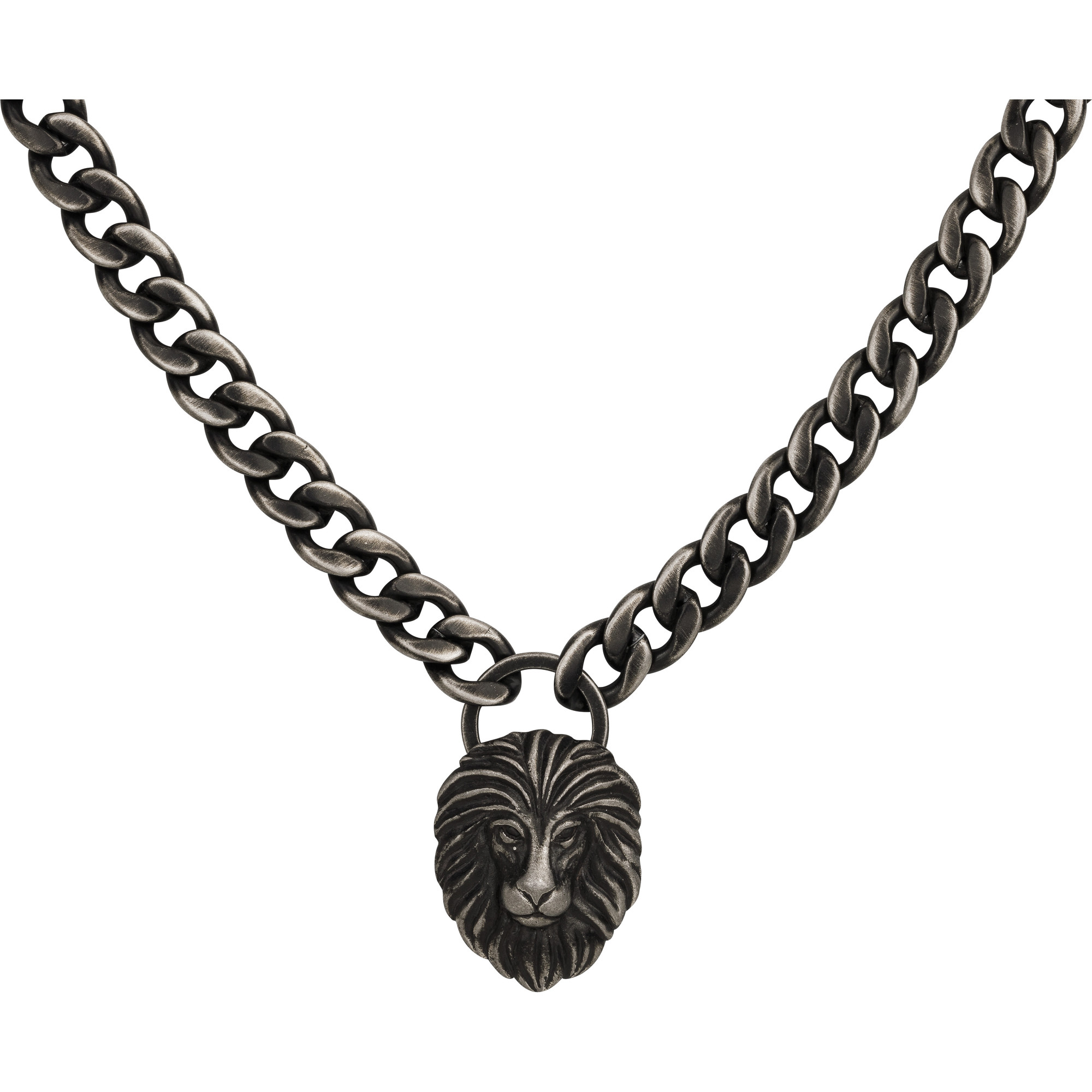 Collier Legend, pendentif tête de lion sur grosse chaine gourmette, en acier 316L inoxydable vintage. Longueur réglable de 50 à 55 cm. Fermoir mousqueton.