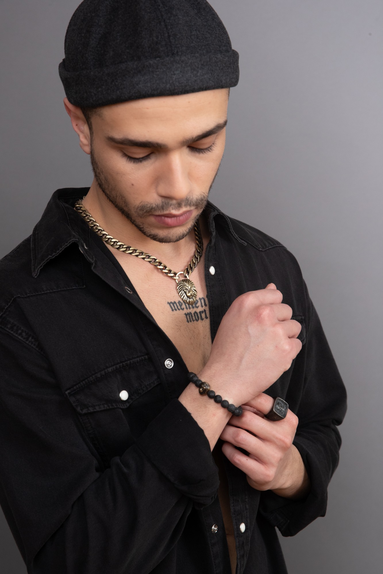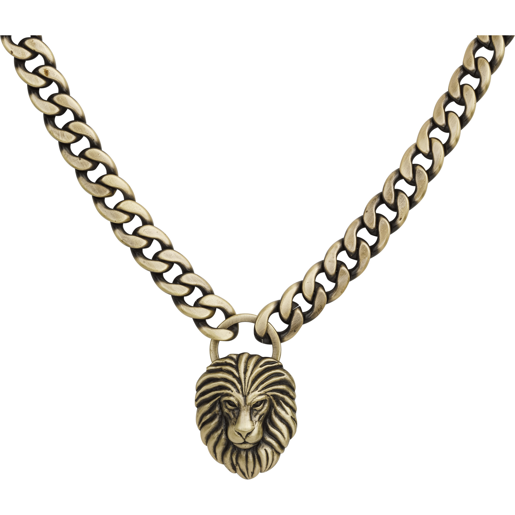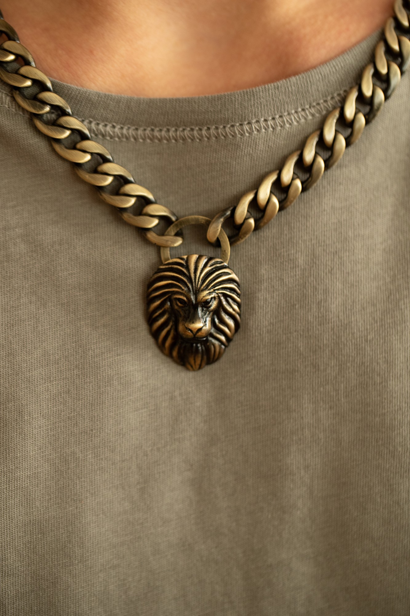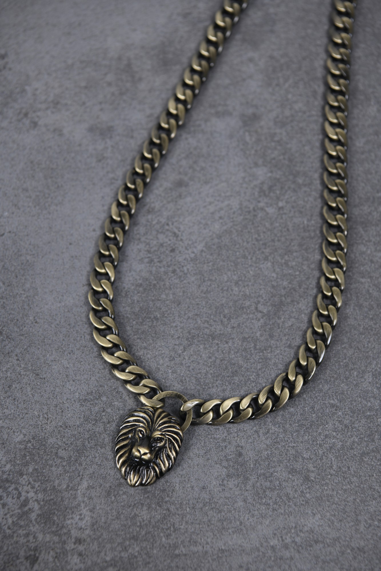 Collier Legend, pendentif tête de lion sur grosse chaine gourmette, en acier 316L inoxydable bronze. Longueur réglable de 50 à 55 cm. Fermoir mousqueton.