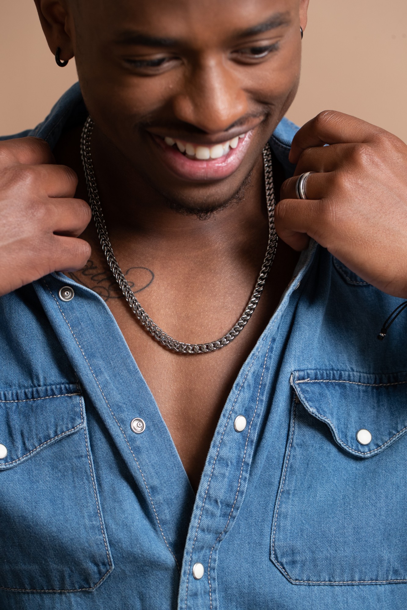 Une chaîne élégante et masculine qui résiste au temps. En acier 316L inoxydable, le collier Milo est parfait pour renforcer ton look masculin sans rien perdre en élégance. Cette solide chaîne à double maille de 55 cm, fermée par un mousqueton, est garantie 2 ans. Un bijou esthétique et durable qui valorise ton style. La chaîne pour homme est un accessoire polyvalent, à décliner avec tes différents styles. Fais vibrer tes tenues du quotidien avec ce bijou inoxydable Phebus, que tu peux également associer avec d'autres colliers.
